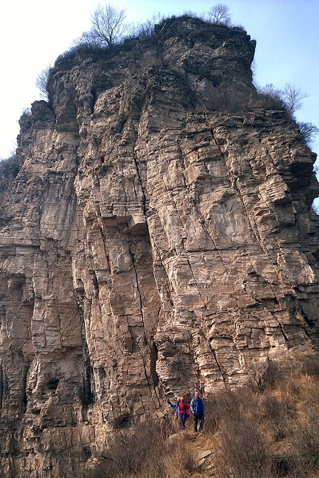 吃饱喝足继续前行,不久便来到了真正的棺材山下,左边的山崖就是棺材山,右侧的小山就是上面上面提到的照片中左边的山头。仔细找一下照片中的人,就知道这山有多高了。