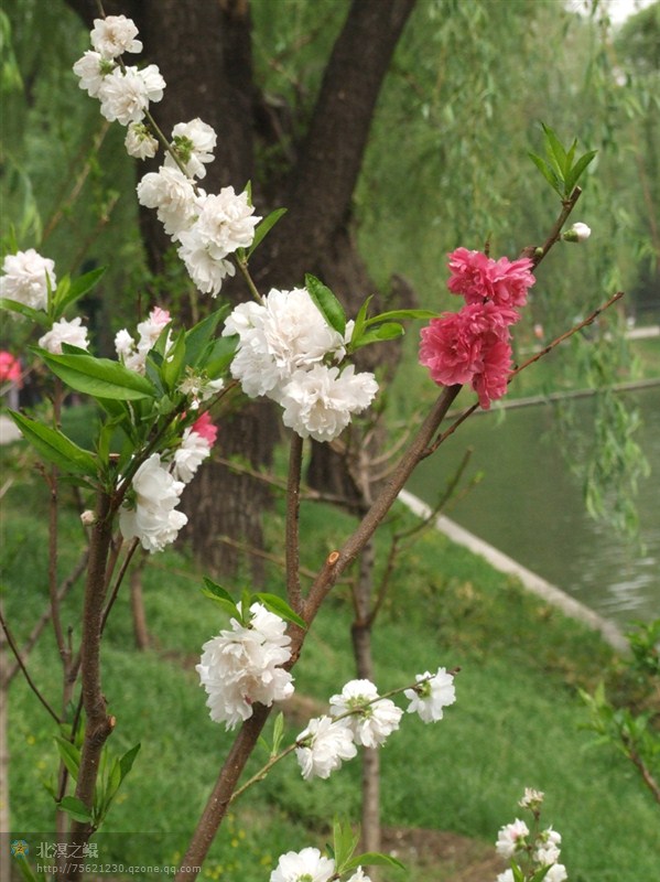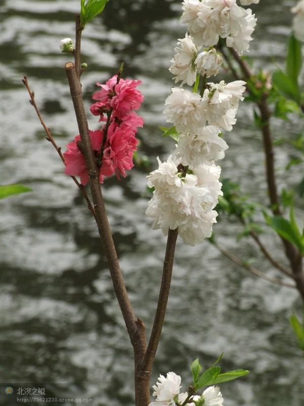 在河边上拍的一株奇特的树,同一根枝上有一束红花,一束白花