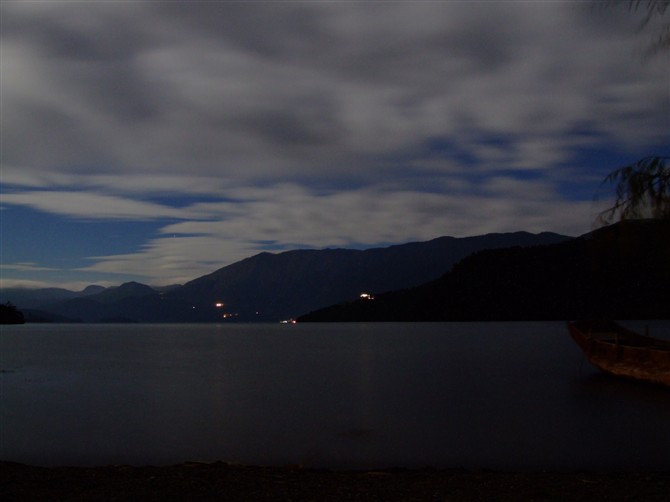 泸沽湖的夜色真美。湖面在微风的吹拂下荡起层层涟漪,激起的波浪轻轻地拍打着岸边,又推动着小船上下摇摆,水面的波纹将对岸灯火的倒影打成了一根根金线,给人一种恬静的感觉。波浪拍打湖岸的哗哗声,和上小木船摇摆时发出的咯吱咯吱声,更衬托出了夜的宁静。近处的山是黑色的,远处的山是暗灰色的,天空是亮灰色的,湖面映着天空,远处的湖面和天空融为一体,再也分不出哪里是天,哪里是湖。正值九月十六月圆之夜,月亮在天上的云里时隐时现,给泸沽湖增添了一种神秘感。